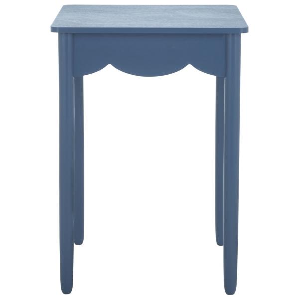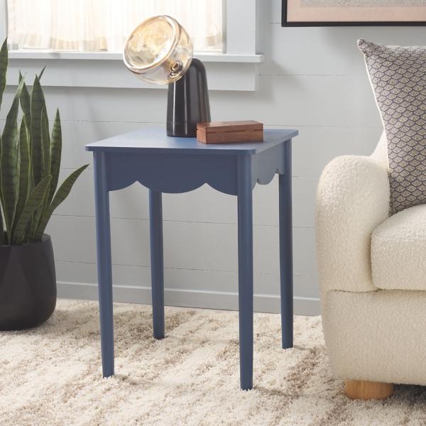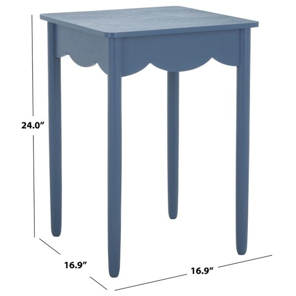 Bring elegance to your space with the smooth, contemporary design of this Blue Scalloped Cottage Kalina Accent Table. Its beautifully scalloped edge gives this table a charming touch of whimsy! Overall dimensions Width: 16.9 in. Depth: 16.9 in. Height: 24 in. Crafted of pine wood and wood composite Blue finish Square shape Features scalloped details Weight: 9 lbs. Weight capacity: 40 lbs. Assembly required Not intended for commercial use Care: Dust with a soft, dry cloth. Wipe spills immediately. Avoid common hazards such as hot dishes, harsh solvents, and abrasives. Adhesive felt pads to protect flooring are recommended. This item is available at Kirklands.com only, not available in stores. Please note: this item cannot be shipped to APO/FPO addresses.