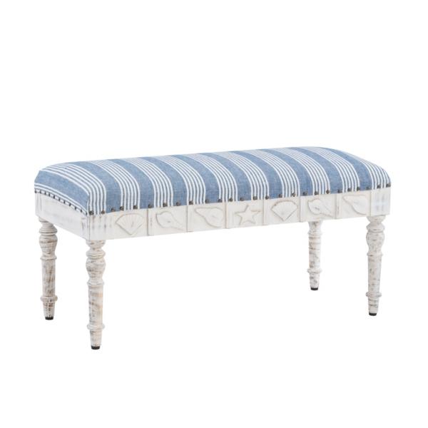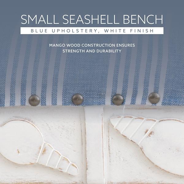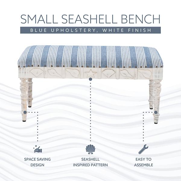 Bring a touch of coastal charm to your space with this Blue Striped Upholstered Wood Seashell Bench! The blue upholstery and seashell designs bring the beach to your home. Bench measures 36W x 16D x 18H in. Crafted of mango wood Upholstered in blue and white striped cotton and filled with high-density foam Antique white wood finish Features a seashell-inspired design Weight: 15.5 lbs. Weight capacity: 400 lbs. Assembly required; see Info & Guides in the drop down below to view or print assembly info Not intended for commercial use Care: Spot clean. This item is available at Kirklands.com only, not available in stores. Please note: this item cannot be shipped to APO/FPO addresses.