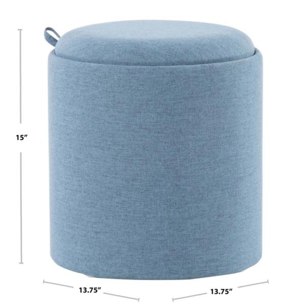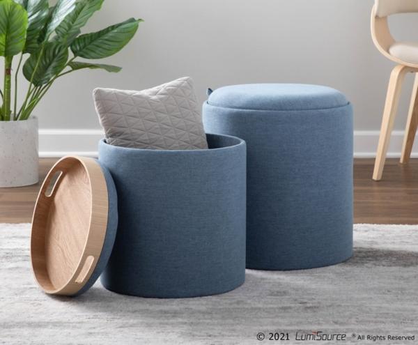 Get style and function in one with our Blue Upholstered Ottomans with Tray Tops! These ottomans make for great storage, extra seating, and even accent tables. Set includes two (2) ottomans Large ottoman measures 15.5L x 15.5W x 17.5H in. Small ottoman measures 13.75L x 13.75W x 15H in. Frame crafted of wood composite Upholstered in a solid blue fabric Top lifts for storage and flips for wooden tray Weight capacity: 250 lbs. No assembly required Not intended for commercial use Care: Dust with a soft, dry cloth. This item is available at Kirklands.com only, not available in stores. Please note: this item cannot be shipped to APO/FPO addresses.