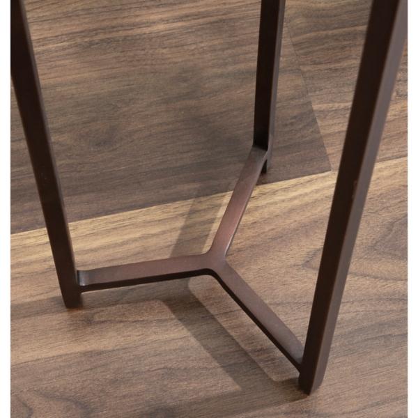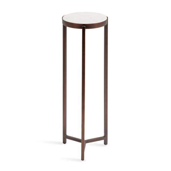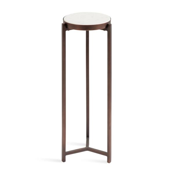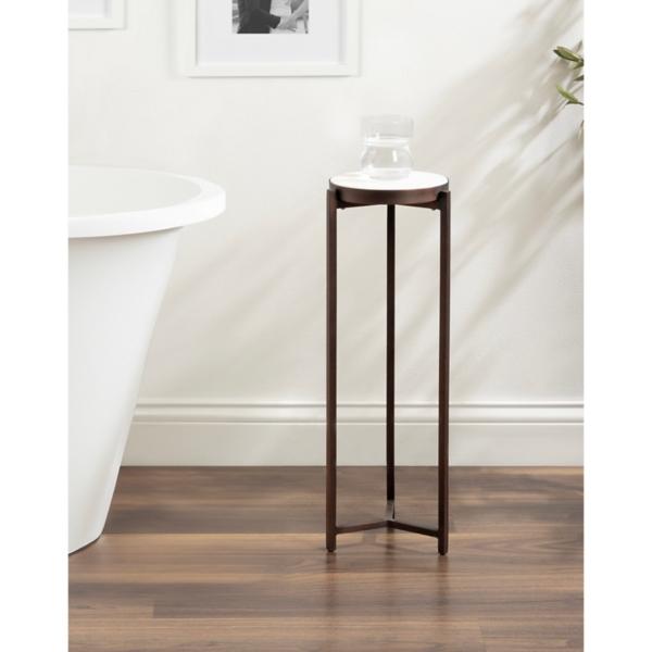 This Bronze Angular Marble Accent Table is a sophisticated accent piece that brings elevated style and glamor to any space in your home! Inspired by modern design, this pedestal table features a frame with clean, simple lines and a bronze finish. Accent table measures 23H x 9 in. in diameter Crafted of metal and authetic marble Satin bronze frame finish White marble tapletop finish Features an angular leg design Compact size Weight capacity: 7 lbs.; weighs 4.78 lbs. No assembly required Not intended for commercial use Care: Dust with a soft, dry cloth. This item is available at Kirklands.com only, not available in stores. Please note: this item cannot be shipped to APO/FPO addresses. WARNING: Cancer and Reproductive Harm - For more information go to www.P65Warnings.ca.gov.