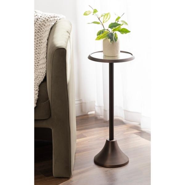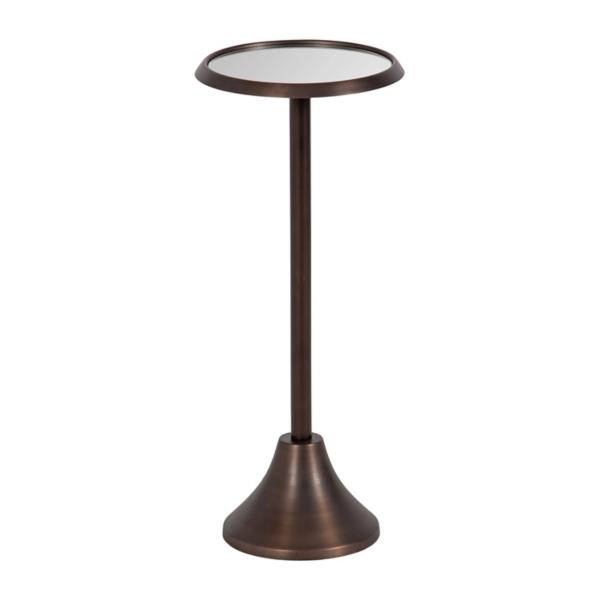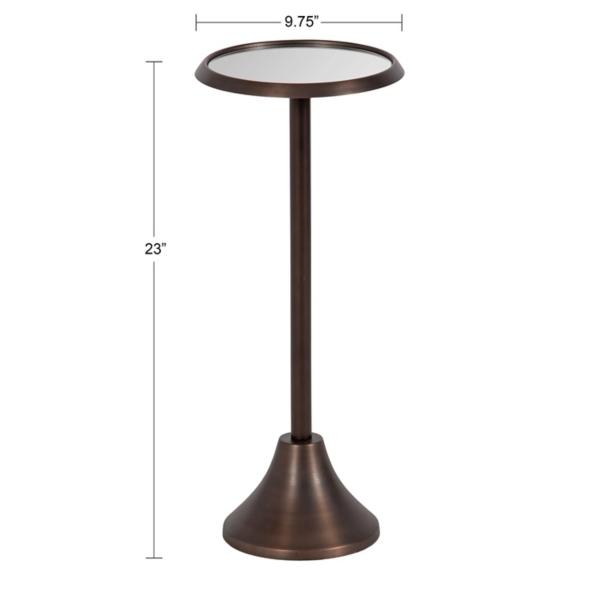 This Bronze Metal Mirrored Sanzo Accent Table is crafted with a stunning mirrored glass tabletop, making it a resilient yet stylish accent piece. Use this sleek side table as a place for your lamp, a drink or two, or a charming plant stand! Accent table measures 23H x 9.75 in. in diameter Crafted of metal Bronze finish Round shape Features a mirrored glass tabletop Weighted base Weight: 6 lbs. Weight capacity: 7 lbs. Some assembly required Not intended for commercial use Care: Wipe with a soft, dry cloth. This item is available at Kirklands.com only, not available in stores. Please note: this item cannot be shipped to APO/FPO addresses.