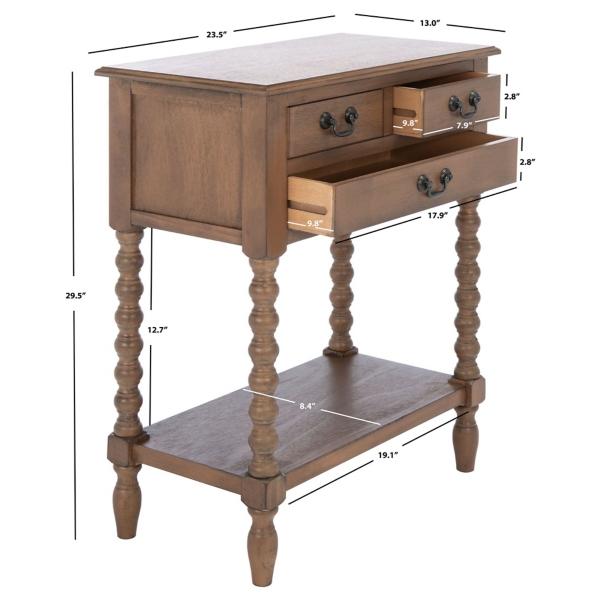 You'll love the traditional, antique look of our Brown Farmhouse 3-Drawer Console Table! With its rustic finish and classic turned legs, this table is perfect for any space in your farmhouse-style home! Table measures 23.5L x 13W x 29.5H in. Crafted of pine Brown finish Features three (3) drawers Accented with ball turned legs Includes one (1) lower shelf Weight capacity: 40 lbs. Some assembly requires Care: Dust regularly with a soft, dry cloth. This item is available at Kirklands.com only, not available in stores. Please note: this item cannot be shipped to APO/FPO addresses. WARNING: This product can expose you to chemicals including wood dust, which is known to the state of California to cause cancer and birth defects or other reproductive harm. For more information go to www.P65Warnings.ca.gov.