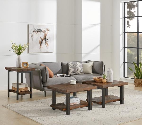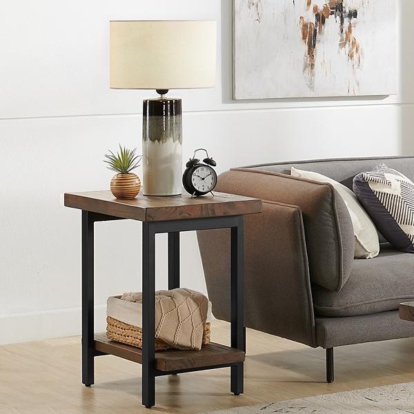 This Brown Pine Wood and Metal Accent Table is a staple for every home. Its classic design and natural wood finish will look great next to your chair or sofa. Plus, the lower shelf is convenient for display or extra storage. Table measures 17L x 27W x 27H in. Crafted of pine wood and metal Black leg finish Reclaimed wood finish Features one (1) fixed shelf Rectangular design Weight capacity: 400 lbs. Assembly required Not intended for commercial use Care: Wipe clean with a damp cloth. This item is available at Kirklands.com only, not available in stores. Please note: this item cannot be shipped to APO/FPO addresses. WARNING: This product can expose you to chemicals including wood dust which is known to the state of California to cause cancer and birth defects or other reproductive harm. For more information go to www.P65Warnings.ca.gov.