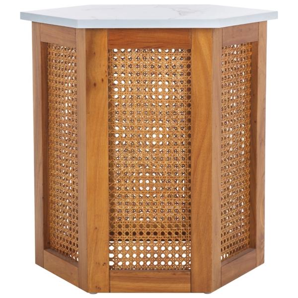 Create a sense of coastal sophistication in your living room with the Brown Rattan and Faux Marble Sophie Accent Table. The wooden frame and cane mesh provide a unique textural mix while the hexagonal shape and faux marble finish create a distinctive, modern design. Overall dimensions Width: 19.7 in. Depth: 17.1 in. Height: 20 in. Crafted of MDF, elm wood, and rattan Brown wood and rattan finish Faux marble top Hexagonal shape Hues of brown and white Weight: 11.7 lbs. Weight capacity: 100 lbs. No assembly required Not intended for commercial use Care: Dust with a soft, dry cloth. Avoid common hazards such as hot dishes, harsh solvents, and abrasives. This item is available at Kirklands.com only, not available in stores. Please note: this item cannot be shipped to APO/FPO addresses.