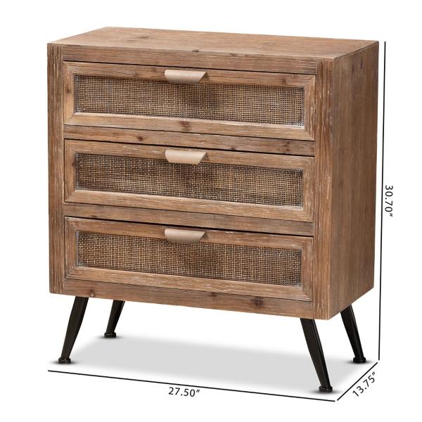 Add some extra storage to any space with this Brown Wood and Rattan 3-Drawer Cabinet. Its rustic, modern style and versatile design make it great for any room, from the entryway to the bedroom! Cabinet measures 27.6L x 13.8W x 30.7H in. Crafted of wood, wood composite, rattan, and metal Whitewashed brown finish Features three (3) drawers Woven rattan drawer faces Black, angled legs Includes anti-topple kit Assembly required Not intended for commercial use Care: Dust with a soft, dry cloth. This item is available at Kirklands.com only, not available in stores. Please note: this item cannot be shipped to APO/FPO addresses. WARNING: This product can expose you to chemicals including formaldehyde and phthalate, which is known to the state of California to cause cancer and birth defects or other reproductive harm. For more information go to www.P65Warnings.ca.gov.