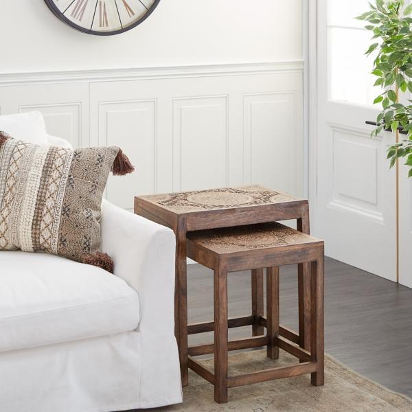 Our Brown Wood Carved Floral Nesting Tables are designed with whimsical accents to transform your space! These decorative tables feature stunning carved mandala and botanical details in differing sizes that offer a nesting component for optimal storage! Set includes two (2) tables Large table measures 22.3L x 14.2W x 24H in. Small table measures 17L x 12.2W x 20H in. Crafted of mango wood Brown finish Features intricately carved mandala and floral accents Weight capacity: 100 lbs. No assembly required Care: Wipe clean with a dry cloth This item is available at Kirklands.com only, not available in stores. Please note: this item cannot be shipped to APO/FPO addresses.
