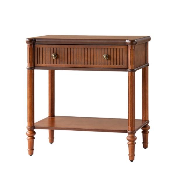 Bring both function and timeless design to your space with this transitional-style Brown Wood Derek Charging End Table! Offering smart storage, it features a drawer with a stylish fluted front and a lower open shelf for books, baskets, or décor. Table measures 26W x 15.7D x 26.1H in. Crafted of wood Brown wood grain finish Features one (1) drawer and one (1) lower shelf Built-in charging station with USB, Type-C, and power outlet Fluted drawer front with vertical reeding Spindle legs Weight: 26 lbs. Weight capacity: 110 lbs. Assembly required Not intended for commercial use Care: Wipe with a soft, dry cloth. This item is available at Kirklands.com only, not available in stores. Please note: this item cannot be shipped to APO/FPO addresses.