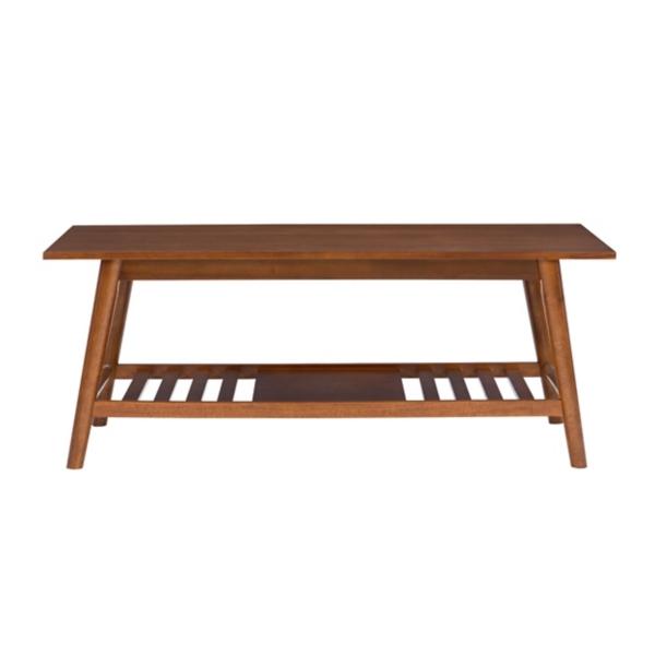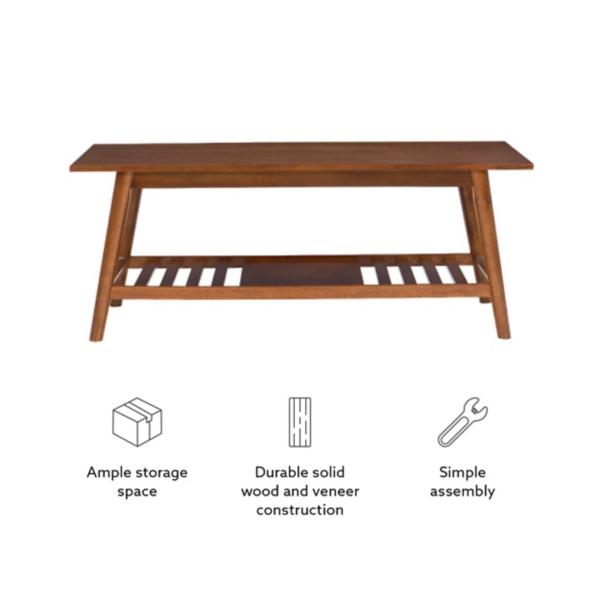 The Brown Wood Slatted Bottom Shelf Coffee Table is the perfect way to add midcentury modern flair to your living room. Display all your boardgames, books, and décor on this stunning piece! Table measures 47L x 23W x 18.5H in. Crafted of rubberwood, solid wood, wood composite, and birch veneer Brown finish Midcentury modern style Features a bottom slatted shelf Rectangular shape Top weight capacity: 100 lbs. Shelf weight capacity: 10 lbs. Assembly required; see Info & Guides below to view or print assembly instructions. Not intended for commercial use Care: Dust with a soft, dry cloth. This item is available at Kirklands.com only, not available in stores. Please note: this item cannot be shipped to APO/FPO addresses. WARNING: This product can expose you to chemicals including DEHP which is known to the state of California to cause cancer and birth defects or other reproductive harm. For more information go to www.P65Warnings.ca.gov.
