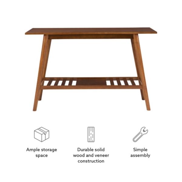 The Brown Wood Slatted Bottom Shelf Console Table is the perfect way to add midcentury modern flair to your entryway. Display all your lamps, books, and décor on this stunning piece! Table measures 47L x 18W x 30H in. Crafted of rubberwood, solid wood, wood composite, and birch veneer Brown finish Midcentury modern style Features a bottom slatted shelf Rectangular shape Top weight capacity: 50 lbs. Shelf weight capacity: 20 lbs. Item weight: 31.97 lbs Assembly required; see Info & Guides below to view or print assembly instructions. Not intended for commercial use Care: Dust with a soft, dry cloth. This item is available at Kirklands.com only, not available in stores. Please note: this item cannot be shipped to APO/FPO addresses. WARNING: This product can expose you to chemicals including DEHP which is known to the state of California to cause cancer and birth defects or other reproductive harm. For more information go to www.P65Warnings.ca.gov.