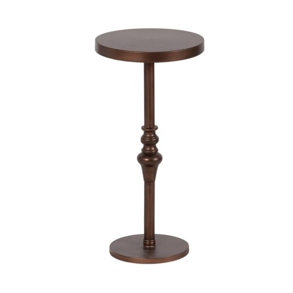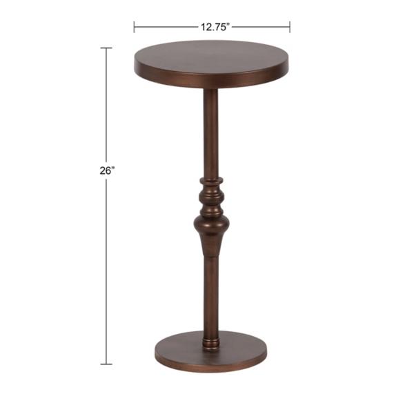 Bring a refined, sophisticated touch to your home with this Brushed Bronze Metal Stratton Accent Table. This vintage-chic table features a pedestal design, making it the perfect cocktail table or plant stand. Accent table measures 26H x 12.75 in. in diameter Crafted of metal Brushed bronze finish Round shape Features a spindle base design Weight: 10 lbs. Weight capacity: 7 lbs. Some assembly required Not intended for commercial use Care: Wipe with a soft, dry cloth. This item is available at Kirklands.com only, not available in stores. Please note: this item cannot be shipped to APO/FPO addresses.