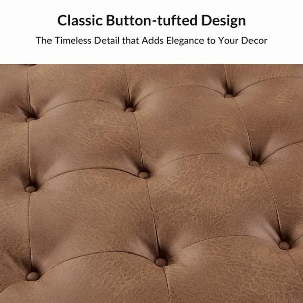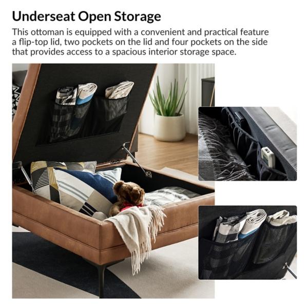 This Camel Faux Leather Irvin Flip-Top Storage Ottoman brings elegance to your space with its rich brown upholstery and sleek black legs. Lift the lid for hidden storage—perfect for blankets, books & more! Ottoman measures 36.5L x 36.5W x 20H in. Crafted with a wood frame and metal legs Upholstered in camel faux leather Black metal leg finish Features a flip top with interior storage space Tufted design Weight: 45 lbs. Weight capacity: 250 lbs. Assembly required Not intended for commercial use Care: Wipe with a soft, dry cloth. This item is available at Kirklands.com only, not available in stores. Please note: this item cannot be shipped to APO/FPO addresses.