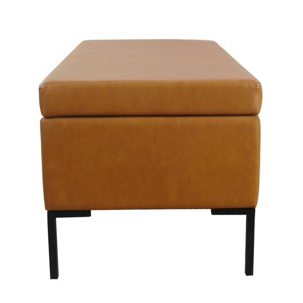 Add an element of convenience and style to your modern farmhouse mudroom! Our Caramel Vegan Leather Storage Bench features a classy design and ample interior space. Bench measures 42L x 20W x 18.5H in. Crafted with a metal frame Upholstered in vegan leather with a foam fill Caramel brown finish with matte black legs Hinged bench top lifts to reveal storage space Weight capacity: 250 lbs. Some assembly required Not intended for commercial use Care: Spot clean only. Not safe for outdoor use. This item is available at Kirklands.com only, not available in stores. Please note: this item cannot be shipped to APO/FPO addresses.