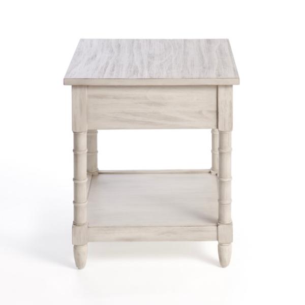 Refresh your space with our Casey Cream End Table Table! Its traditional style will complement any decor and add a classic charm to your home. Tie your space together with the whole Casey collection! End table measures 20W x 20D x 22H in. Crafted of pine wood and pine veneer Wire brushed cream finish Features one (1) drawer and one (1) lower shelf Black metal ring drawer pull Weight: 21 lbs. Assembly required Not intended for commercial use Care: Wipe with a soft, dry cloth. Contact your local Kirkland's store for availability. Quantities and selection may vary by location.