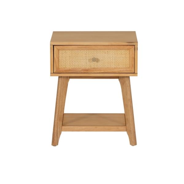 Bring effortless charm and natural warmth to your bedroom with this Cassie Cane and Wood Nightstand! Crafted from wood and cane in a soothing natural finish, it adds a light and airy feel to any room. Nightstand measures 18W x 15D x 22H in. Crafted of rubberwood Natural finish Features a single drawer with a cane inset Lower shelf Angled legs Drawer measures 14.63W x 10.75D x 2.5H in. Weight: 23 lbs. Weight capacity: 20 lbs. Assembly required Not intended for commercial use Care: Dust with a soft, dry cloth.