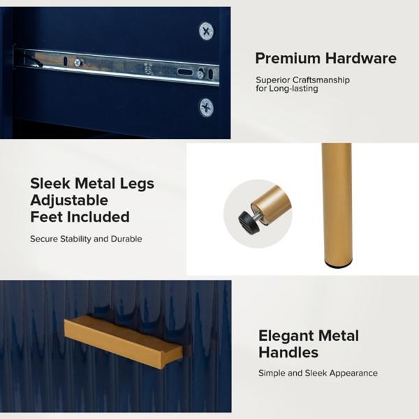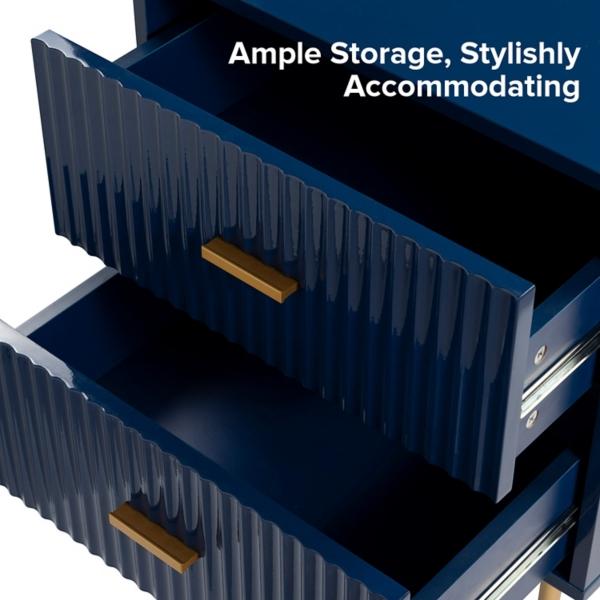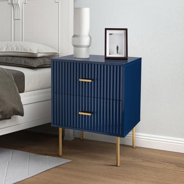 Elevate your bedroom with this stylish and functional Ceandro Navy 2 Drawer Nightstand! Perfect for storing bedside essentials, this nightstand combines practicality with refined design. Nightstand measures 19.7W x 15.7D x 25.2H in. Crafted of manufactured wood and metal Navy blue finish Features two (2) drawers Gold metal pulls and legs Textured drawer fronts Drawers measures 16.3W x 9.3D x 4H in. Weight: 38 lbs. Assembly required Not intended for commercial use Care: Spot clean. This item is available at Kirklands.com only, not available in stores. Please note: this item cannot be shipped to APO/FPO addresses.