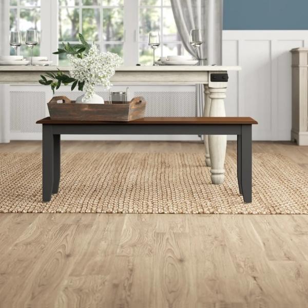 Upgrade your dining space with this Cherry & Black Wood Blooming Dining Bench! This Shaker-style dining bench features a two tone finish for a stylish, sophisticated look. Bench measures 48W x 14D x 17.25H in. Crafted of rubberwood, wood veneer, and MDF Cherry bench top finish Black leg finish Shaker-style design Weight: 16 lbs. Weight capacity: 600 lbs. Minimal assembly required Not intended for commercial use Care: Wipe with a soft, dry cloth. This item is available at Kirklands.com only, not available in stores. Please note: this item cannot be shipped to APO/FPO addresses.