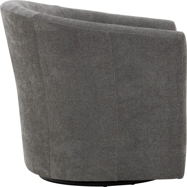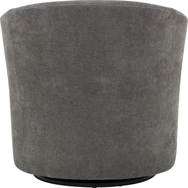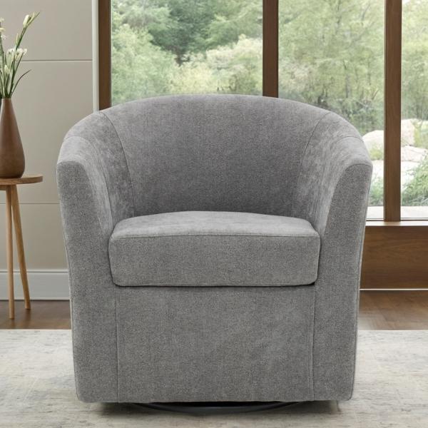 Upgrade your space with this Chloe Gray Upholstered Swivel Chair! The smooth 360-degree swivel base offers flexibility and ease, making it an ideal choice for living rooms, bedrooms, reading nooks, or home offices. Accent chair measures 27W x 30.5D x 30H in.; seat height: 19 in. Crafted with a wood and metal frame Black metal finish Upholstered in gray polyester and filled with high-density foam Features 360 degree swivel capability Flared arms Removable seat cushion Seat measures 20.5W x 19.5D in. Weight: 34 lbs. Weight capacity: 300 lbs. No assembly required Made in the United States Not intended for commercial use Care: Spot clean. This item is available at Kirklands.com only, not available in stores. Please note: this item cannot be shipped to APO/FPO addresses.