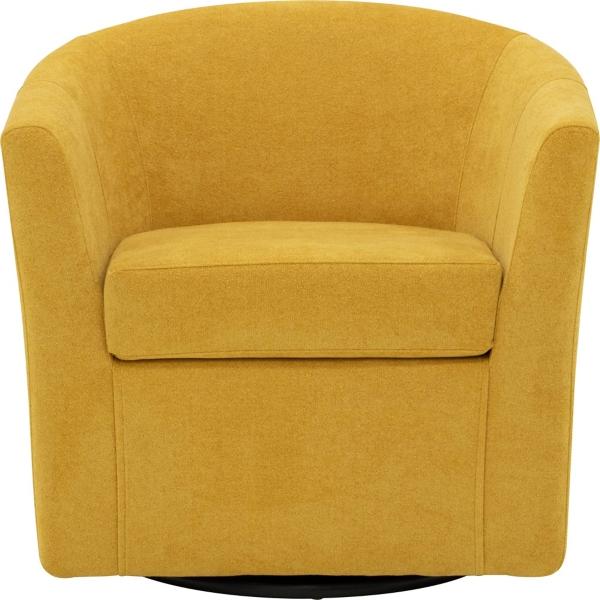 Upgrade your space with this Chloe Marigold Upholstered Swivel Chair! The smooth 360-degree swivel base offers flexibility and ease, making it an ideal choice for living rooms, bedrooms, reading nooks, or home offices. Accent chair measures 27W x 30.5D x 30H in.; seat height: 19 in. Crafted with a wood and metal frame Black metal finish Upholstered in gold polyester and filled with high-density foam Features 360 degree swivel capability Flared arms Removable seat cushion Seat measures 20.5W x 19.5D in. Weight: 34 lbs. Weight capacity: 300 lbs. No assembly required Made in the United States Not intended for commercial use Care: Spot clean. This item is available at Kirklands.com only, not available in stores. Please note: this item cannot be shipped to APO/FPO addresses.