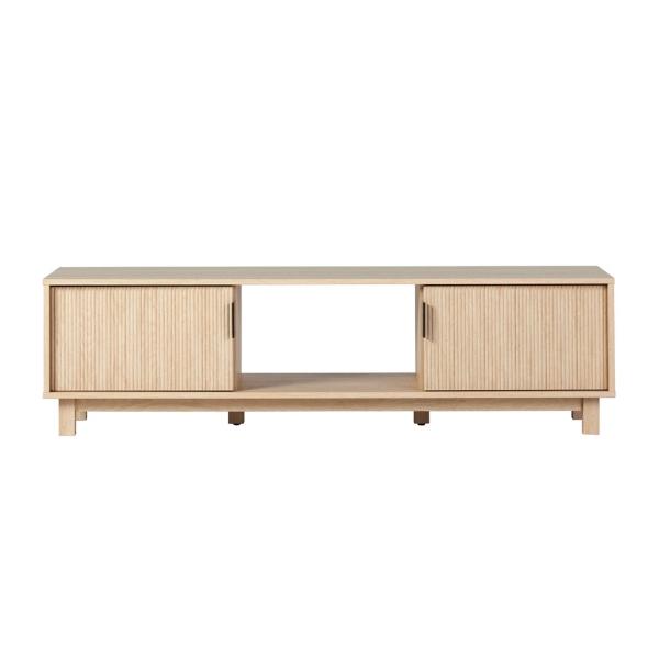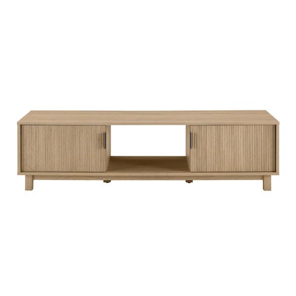 Whether you’re into an art-deco design or a modern motif, this Coastal Oak Fluted 2-Door Compact TV Stand is what you’ve been looking for! With its sleek, subtle hardware, fluted doors, and open storage cubby, your tech will be perfectly perched in style. Cabinet measures 58W x 15.75D x 16H in. Crafted of warp-resistant MDF and durable laminate Natural finish Fluted door design Features two (2) cabinets and one (1) open shelf Minimalist metal hardware Sleek, low profile Weight: 57 lbs. Weight capacity: 50 lbs. Assembly required; see Info & Guides in the drop down below to view or print assembly isntructions Not intended for commercial use Care: Wipe clean with a dry cloth. This item is available at Kirklands.com only, not available in stores. Please note: this item cannot be shipped to APO/FPO addresses.