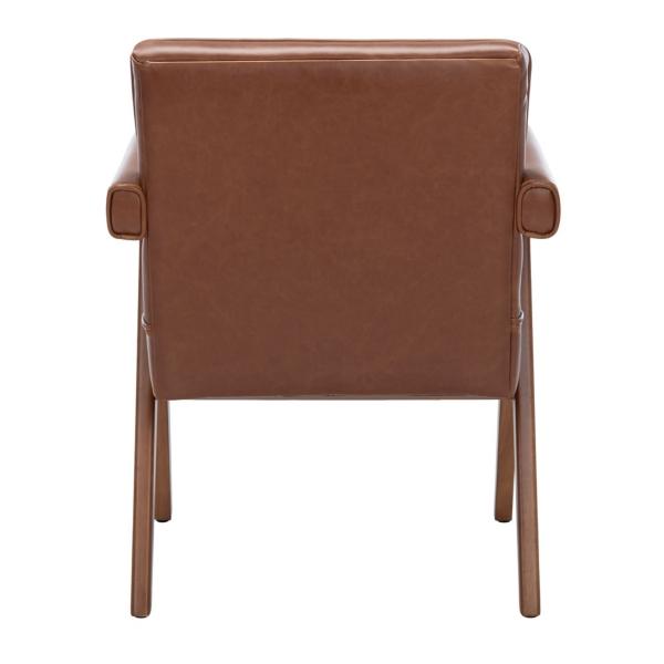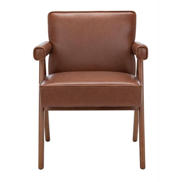 Elevate your space with this Cognac Faux Leather Mid-Century Kate Accent Chair! This sophisticated, vintage-inspired chair features rich brown faux leather cushions and bolster-style arms that allow you to relax in luxury. Chair measures 23.2W x 24D x 29.9H in.; seat height: 18.9 in. Crafted with a wood frame Upholstered in PU leather and filled with high-density foam Walnut wood leg finish Cognac upholstery finish Features an A-frame design Bolster-style armrests Weight: 19 lbs. Weight capacity: 275 lbs. No assembly required Not intended for commercial use Care: Spot clean. This item is available at Kirklands.com only, not available in stores. Please note: this item cannot be shipped to APO/FPO addresses.