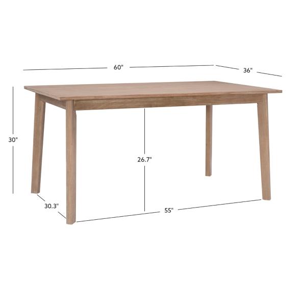 This spacious Colleen Natural Midcentury Dining Table will complement a wide range of decor schemes. Perfect for smaller spaces, this table can comfortably seat six people. Table measures 60L x 36W x 30H in. Crafted of rubberwood Natural tan wood finish Features a simple, midcentury design Weight capacity: 100 lbs. Some assembly required; see Info & Guides below to view or print assembly instructions. Not intended for commercial use Care: Wipe with a soft, damp cloth. This item is available at Kirklands.com only, not available in stores. Please note: this item cannot be shipped to APO/FPO addresses. WARNING: This product can expose you to chemicals including DEHP which is known to the state of California to cause cancer and birth defects or other reproductive harm. For more information go to www.P65Warnings.ca.gov.