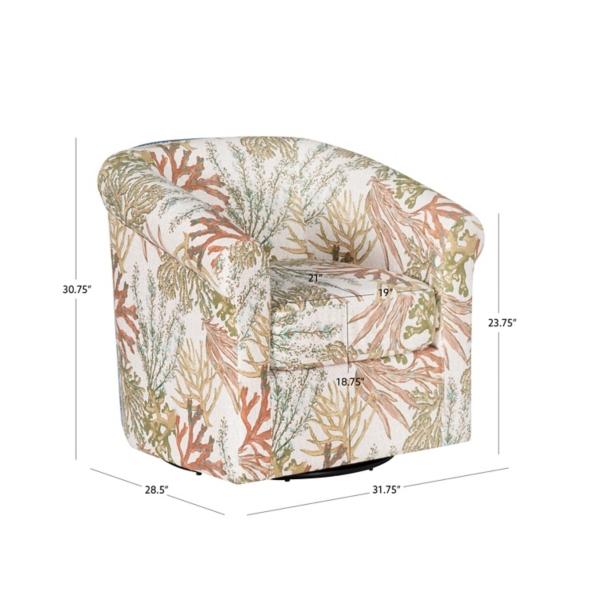 This Colorful Ocean Bonnie Swivel Accent Chair features lively coral patterns to create a welcoming coastal aesthetic. Plus, the arched back, roll arms, and generously padded seat offer superior comfort. Its compact silhouette makes it especially ideal in small spaces! Accent chair measures 31.75W x 28.5D x 30.75H in.; seat height: 18.75 in. Crafted with a wood and metal frame Upholstered in fade resistant, moisture-wicking polyester with high-density foam fil Accented with a coral reef pattern Hues of coral pink, green, blue, and ivory Features 360 degree swivel capability Weight: 51.2 lbs. Weight capacity: 275 lbs. No assembly required Not intended for commercial use Care: Spot clean with water only. Distilled water is ideal. To simply dab spots use a clean white or cream towel. Avoid colored cloths that might bleed their color onto the fabric. This item is available at Kirklands.com only, not available in stores. Please note: this item cannot be shipped to APO/FPO addresses.