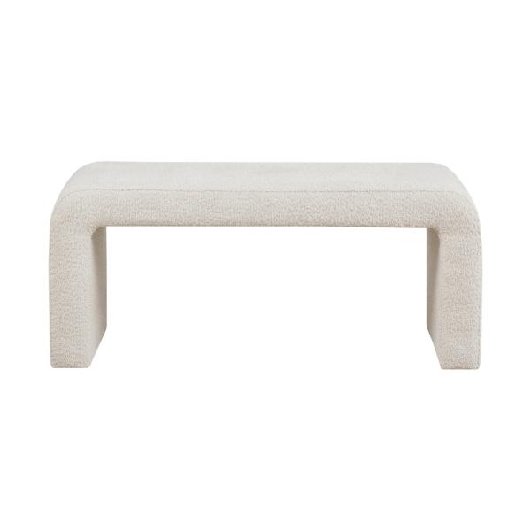 Our Cream Boucle Waterfall Bench features a sleek design with rounded corners in soft, boucle fabric. This cozy bench is the perfect addition to any modern home! Bench measures 42L x 16W x 18H in. Crafted of solid wood and plywood Upholstered in polyester with a high-density foam cushion fill Cream boucle upholstery finish Accented with rounded corners Weight capacity: 400 lbs. No assembly required Care: Spot clean. This item is available at Kirklands.com only, not available in stores. Please note: this item cannot be shipped to APO/FPO addresses.WARNING: Cancer and Reproductive Harm - For more information go to www.P65Warnings.ca.gov.