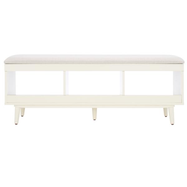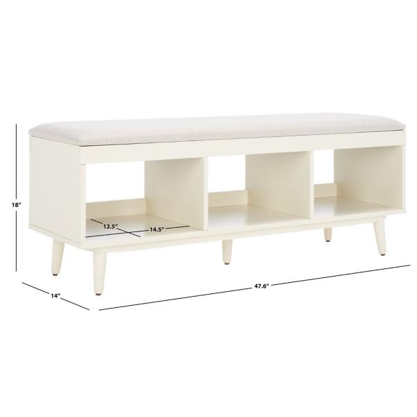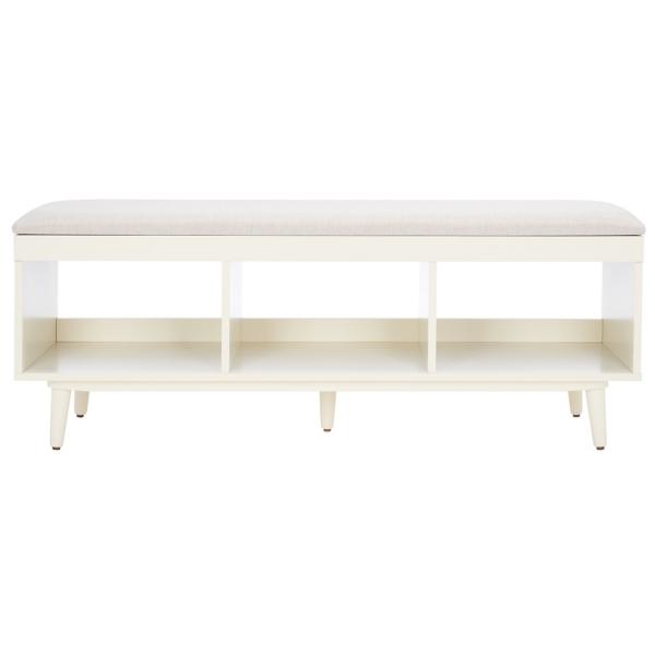 Give any space a hint of retro-chic style with this Cream Linen Norma Open Shelf White Bench! This bench is ideal for storage and display while a cream linen cushion makes for comfortable lounging. Bench measures 47.6W x 14D x 18H in. Crafted of mahogany wood with acacia veneer White finish Upholstered in cream linen and filled with high-density foam Features three (3) open shelves Shelves measure 14.5W x 12.5D x 8.7H in. Weight: 42 lbs. Weight capacity: 300 lbs. Assembly required Not intended for commercial use Care: Spot clean. This item is available at Kirklands.com only, not available in stores. Please note: this item cannot be shipped to APO/FPO addresses.