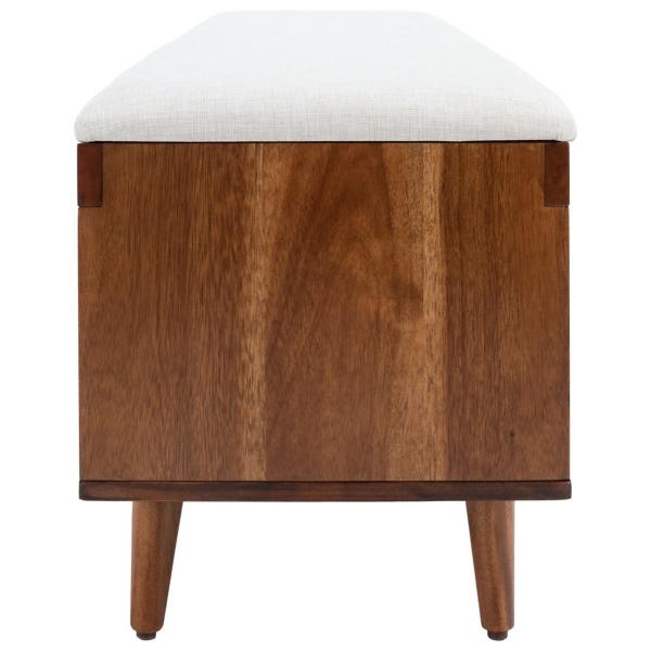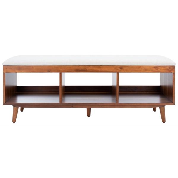 Give any space a hint of retro-chic style with this Cream Linen Norma Open Shelf Wood Bench! This bench is ideal for storage and display while a cream linen cushion makes for comfortable lounging. Bench measures 47.6W x 14D x 18H in. Crafted of mahogany wood with acacia veneer Natural acacia finish Upholstered in cream linen and filled with high-density foam Features three (3) open shelves Shelves measure 14.5W x 12.5D x 8.7H in. Weight: 42 lbs. Weight capacity: 300 lbs. Assembly required Not intended for commercial use Care: Spot clean. This item is available at Kirklands.com only, not available in stores. Please note: this item cannot be shipped to APO/FPO addresses.
