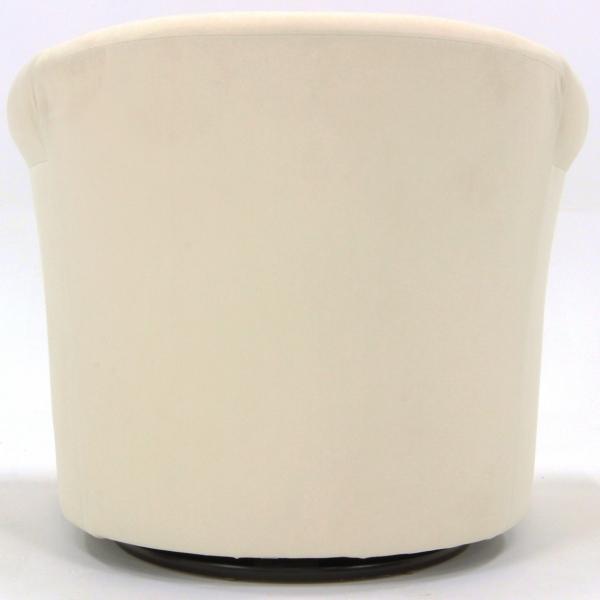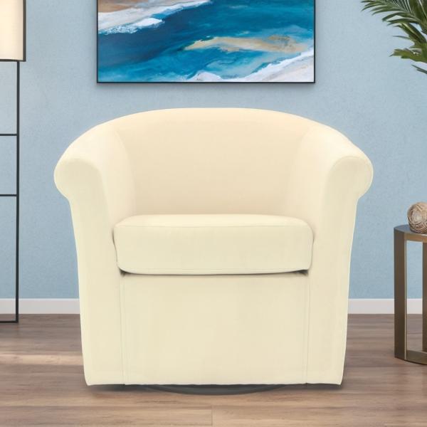 Elevate your living space with this Cream Marlee Swivel Accent Chair! Featuring a sleek barrel silhouette and gracefully curved armrests, this chair brings a refined yet inviting presence to any room. Accent chair measures 30.5W x 27D x 30H in.; seat height: 19 in. Crafted with a wood and metal frame Upholstered in cream polyester and filled with high-density foam Features a traditional club chair design Curved armrests and backrest 360 degree swivel capability Weight: 34 lbs. Weight capacity: 250 lbs. Assembly required Made in the United States with sustainable materials Not intended for commercial use Care: Spot clean. This item is available at Kirklands.com only, not available in stores. Please note: this item cannot be shipped to APO/FPO addresses.