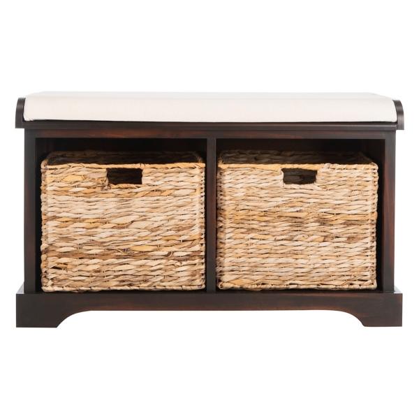 This Dark Brown Upholstered Louella Storage Bench is a versatile addition to any room! Perfect for changing shoes in an entryway or storing towels in a bathroom, its woven baskets keep your house neat and tidy with a stylish touch. Bench measures 33.5W x 16.1D x 19.9H in. Crafted of pine and MDF Dark brown finish Features a white canvas seat cushion filled with high-density foam fill Includes two (2) woven storage baskets Weight: 35 lbs. Weight capacity: 300 lbs. No assembly required Not intended for commercial use Care: Spot clean. This item is available at Kirklands.com only, not available in stores. Please note: this item cannot be shipped to APO/FPO addresses.