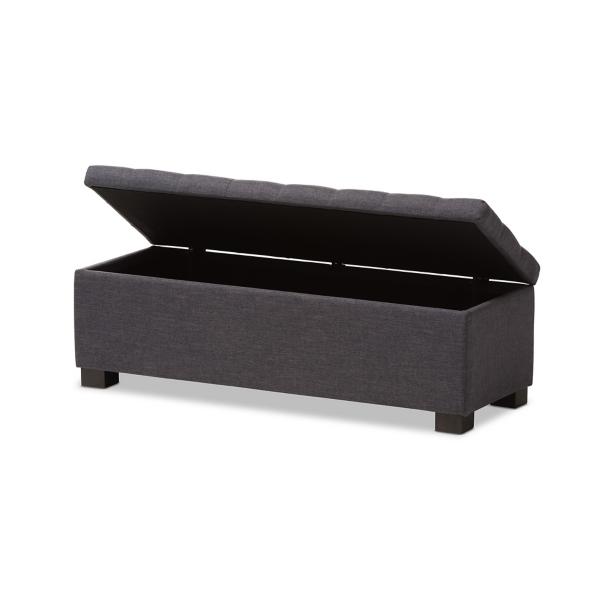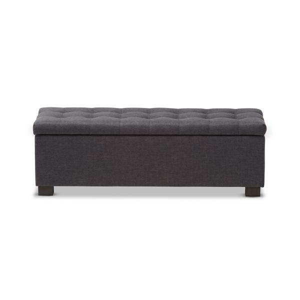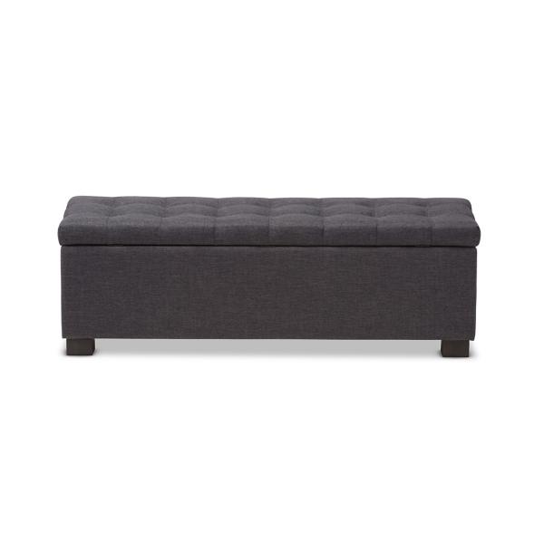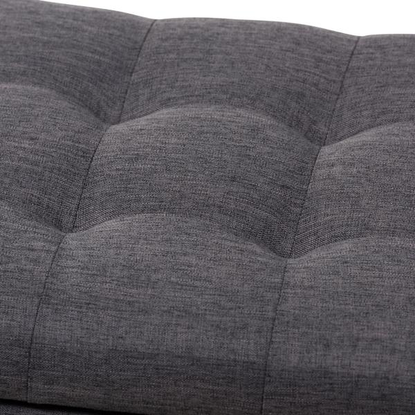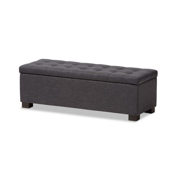 This Dark Gray Tufted Contemporary Storage Bench is the perfect place to store everything from extra blankets to shoes! Place it at the end of your bed for a functional touch of style. Bench measures 16.73L x 46.06W x 15.35H in.; Seat height measures 15.35H in. Crafted of rubberwood and wood composite Upholstered storage bench Lid lifts open Features gray, tufted fabric Black, solid wood legs Assembly required Weight capacity: 190 lbs. Not intended for commercial use Care: Spot clean only. This item is available at Kirklands.com only, not available in stores. Please note: this item cannot be shipped to APO/FPO addresses. WARNING: This product can expose you to chemicals including formaldehyde and phthalate which is known to the state of California to cause cancer and birth defects or other reproductive harm. For more information go to www.P65Warnings.ca.gov.