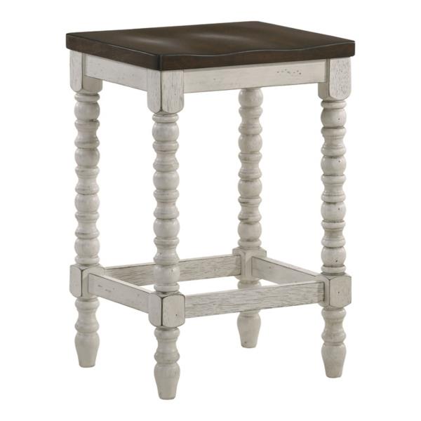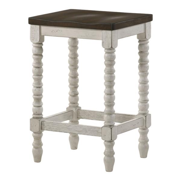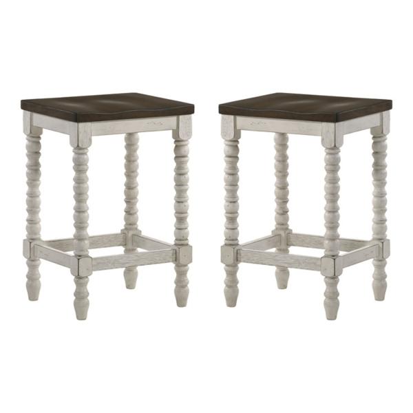 Bring a cozy, cottage-inspired look to your home with these Dark Walnut & White Wood Ema Counter Stools! Featuring rustic finishes and antique-inspired spindle legs, these stools pair perfectly with the Dark Walnut & White Wood Ema Counter Height Table! Set includes two (2) counter stools Each stool measures 15.75W x 13.75D x 24H in. Crafted of wood Dark wood seat finish Antique white base finish Features contoured seats Spindle legs Backless design with built-in footrests Weight capacity: 200 lbs. Assembly required Not intended for commercial use Care: Wipe with a soft, dry cloth. This item is available at Kirklands.com only, not available in stores. Please note: this item cannot be shipped to APO/FPO addresses.