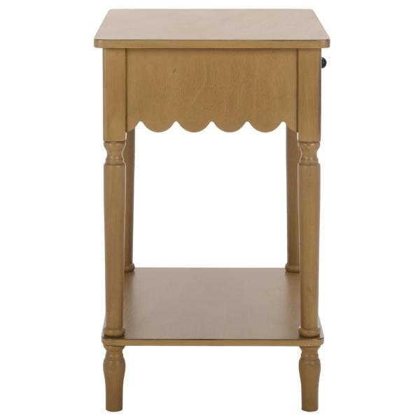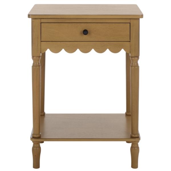 Add a delightfully charming touch to any corner with this Desert Brown Wood 1-Drawer Cottage Accent Table! From your bedroom to your living room, this table provides storage while showcasing a stylish scalloped design. Accent table measures 18.9W x 15.7D x 26H in. Crafted of pine and MDF Brown finish Features one (1) pull-out drawer and one (1) lower shelf Scalloped apron Weight: 17.5 lbs. Weight capacity: 40 lbs. Some assembly required; see Info & Guides in the drop down below to view or print assembly instructions Not intended for commercial use Care: Wipe with a soft, dry cloth. This item is available at Kirklands.com only, not available in stores. Please note: this item cannot be shipped to APO/FPO addresses.