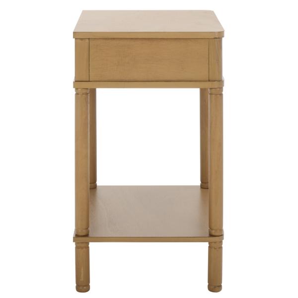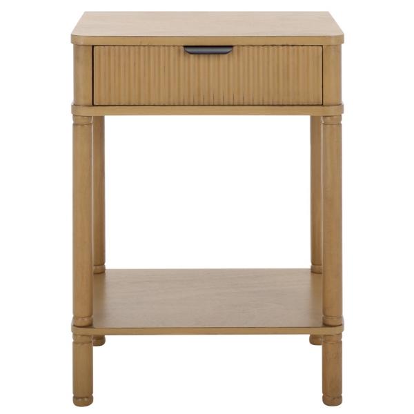 From narrow hallways to small living rooms, this compact Desert Brown Wood Mina End Table will deliver style and function to your home! Its sleek lines are complemented by its fluted drawer design for a touch of modern elegance to your space. End table measures 17.7W x 13.8D x 24H in. Crafted of pine and MDF Brown finish Features one (1) pull-out drawer and one (1) lower shelf Fluted drawer front Weight: 16.5 lbs. Weight capacity: 40 lbs. Some assembly required; see Info & Guides in the drop down below to view or print assembly instructions Not intended for commercial use Care: Wipe with a soft, dry cloth. This item is available at Kirklands.com only, not available in stores. Please note: this item cannot be shipped to APO/FPO addresses.