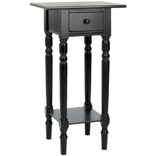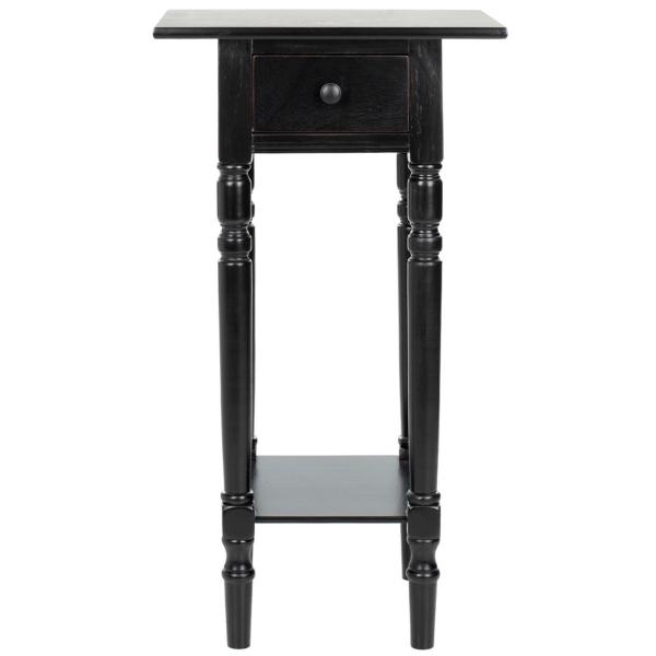 Highlighting the best of country-chic decor, this Distressed Black Wood Emilie Petite End Table is the ideal small-space solution! Its classic carved details and distressed black finish complements any room with ease and style. End table measures 17.7W x 13.8D x 31.9H in. Crafted of pine wood Distressed black finish Features one (1) drawer and one (1) lower shelf Turned legs Drawer measures 7.7W x 10.8D x 3.9H in. Weight: 15 lbs. Weight capacity: 35 lbs. Assembly required Not intended for commercial use Care: Wipe with a soft, dry cloth. This item is available at Kirklands.com only, not available in stores. Please note: this item cannot be shipped to APO/FPO addresses.