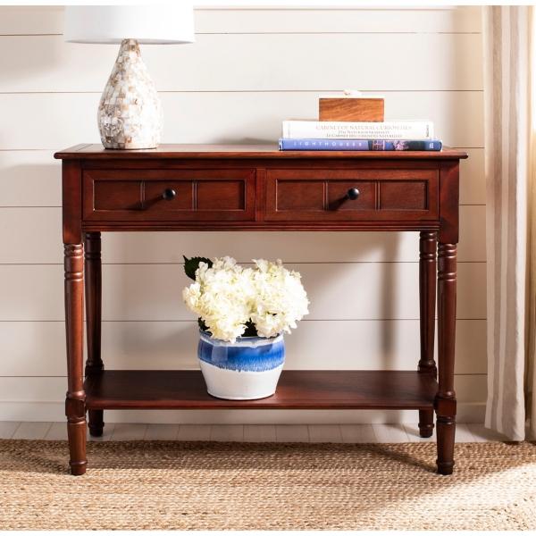 Create a charming entryway display with this Distressed Brown Wood 2-Drawer Console Table. Featuring classic turned legs, it's sure to incorporate a timeless element into your space. Table measures 35.8L x 13.8W x 29.5H in. Crafted of pine wood and wood composite Distressed brown finish Features two (2) drawers and one (1) bottom shelf Accented with turned legs and carved details Rectangular shape Weight capacity: 50 lbs. Assembly required Not intended for commercial use Care: Dust with a soft, dry cloth. This item is available at Kirklands.com only, not available in stores. Please note: this item cannot be shipped to APO/FPO addresses. WARNING: This product can expose you to chemicals including wood dust which is known to the state of California to cause cancer and birth defects or other reproductive harm. For more information go to www.P65Warnings.ca.gov.