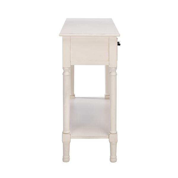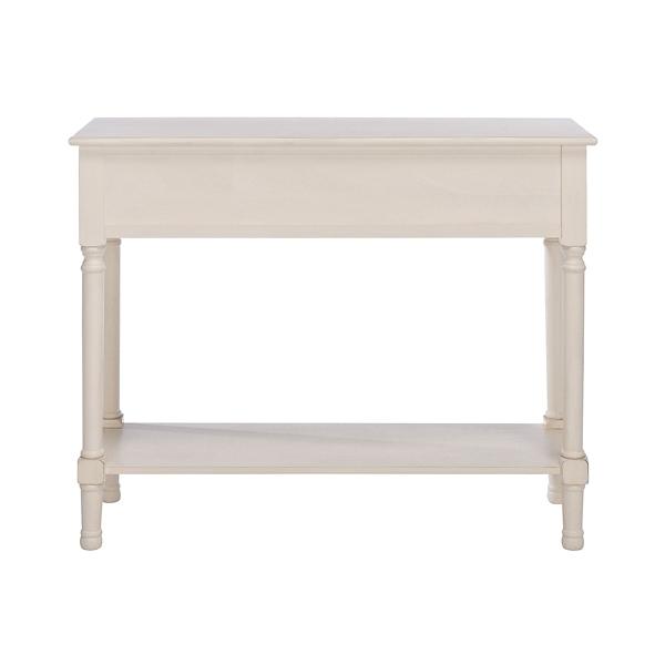 The Distressed Natural Ronan 2-Drawer Console Table pairs well with any decor style from farmhouse to contemporary! With its classic turned legs and striated details, this table embodies modern traditional charm. Table measures 35.5L x 13W x 29.5H in. Crafted of pine wood and wood composite White finish Distressed gray drawer finish Features two (2) drawers Includes a bottom shelf Accented with striated drawer details and black metal hardware Weight capacity: 40 lbs. Assembly required Not intended for commercial use Care: Dust with a soft, dry cloth. This item is available at Kirklands.com only, not available in stores. Please note: this item cannot be shipped to APO/FPO addresses. WARNING: This product can expose you to chemicals including wood dust which is known to the state of California to cause cancer and birth defects or other reproductive harm. For more information go to www.P65Warnings.ca.gov.