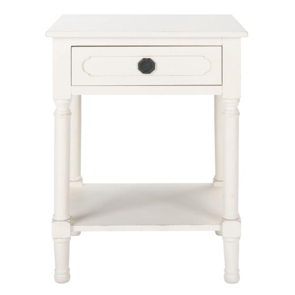 This Distressed White Wood Veranda End Table is the perfect addition to any classic contemporary décor. Its traditionally inspired carved details are given a modern farmhouse touch in a distressed white finish. End table measures 19W x 15.8D x 26H in. Crafted of pine wood and MDF Distressed white finish Features one (1) drawer and one (1) lower shelf Carved drawer front Drawer measures 13.3W x 9.8D x 3.5H in. Shelf measures 14.3W x 11.2D x 12.4H in. Weight: 18 lbs. Weight capacity: 40 lbs. Assembly required; see Info & Guides in the drop down below to view or print assembly info Not intended for commercial use Care: Wipe with a soft, dry cloth. This item is available at Kirklands.com only, not available in stores. Please note: this item cannot be shipped to APO/FPO addresses.