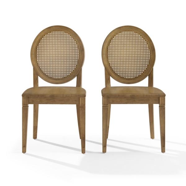 Elevate your dining space with the timeless style of these Driftwood Cane Katia Dining Chairs! These chairs feature graceful oval backs with traditional caning, offering a light, airy feel and a touch of vintage charm. Set includes two (2) chairs Each chair measures 19W x 23D x 37.13H in. Crafted of rubberwood and paper rattan Driftwood finish Features an oval cane-back design Adjustable levelers on legs Seat measures 19W x 17.5D x 17.88H in. Weight capacity: 250 lbs. Assembly required; see Info & Guides in the drop down below to view or print assembly info Not intended for commercial use Care: Wipe with a soft, dry cloth. This item is available at Kirklands.com only, not available in stores. Please note: this item cannot be shipped to APO/FPO addresses.