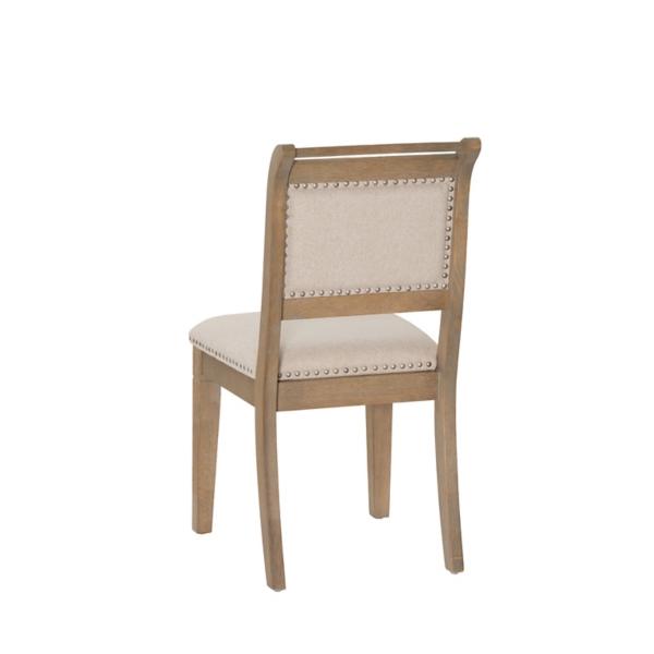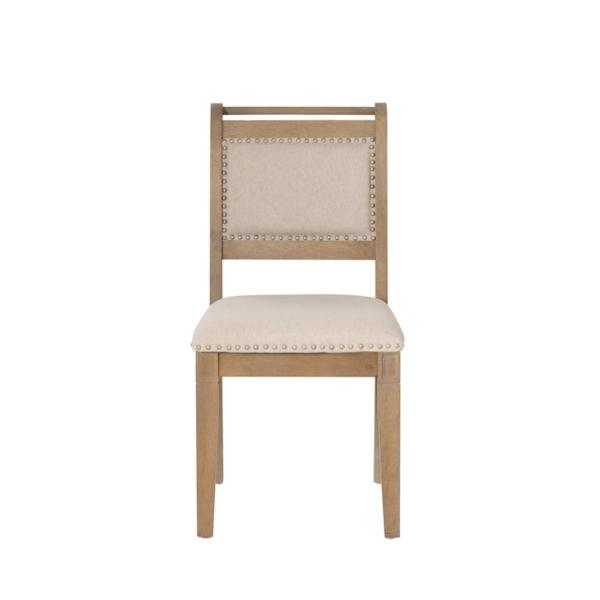 This Emerson Upholstered Wood Dining Chair brings rustic warmth and casual refinement to the table. The rolled backrest is framed by a carved top rail and wrapped in beige linen-look fabric that's soft to the touch and a breeze to maintain! Dining chair measures 17.75W x 23.5D x 36H in.; seat height: 19 in. Crafted with a rubberwood frame Weathered gray wash finish finish Upholstered in beige polyester and filled with high-density foam Features gently rolled backrest and top rail Accented with brushed silver nailhead trim Weight: 18 lbs. Weight capacity: 275 lbs. Some assembly required Not intended for commercial use Care: Spot clean only.