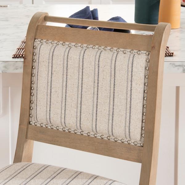 Accent your dining space with a bold pattern using our Emma Gray Counter Stool with Nailhead Trim. Its striking design is sure to catch and keep the eye of your guests! You'll love how this piece invigorates your dining space. Stool measures 22L x 18.25W x 41H in.: Seat height: 26H in. Crafted with a wood frame Rustic wash wood finish Upholstered in a striped patterned fabric Foam fill seat and back Has brushed silver nailhead trim Features foot rest and back bar Hues of gray and blue Weight limit: 275 lbs. Some assembly required Not intended for commercial use Care: Spot clean only. This item is available at Kirklands.com only, not available in stores. Please note: this item cannot be shipped to APO/FPO addresses.