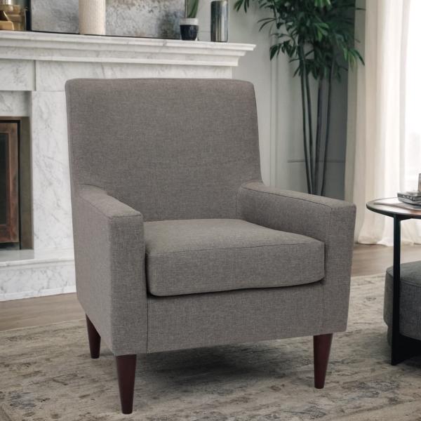 Add a hint of sophistication to your home with this Emma Quartz Upholstered Accent Chair. Featuring classic design that is elevated by clean, modern lines, this chair will bring beautiful style and comfort to any space! Chair measures 30L x 28W x 34.5H in.; seat height: 19 in. Crafted with a wood frame Upholstered in polyester and filled with high-density foam Brown leg finish Gray upholstery finish Features a track arm design Crafted with sustainable materials Weight capacity: 250 lbs.; weighs 29 lbs. Minimal assembly required Made in the United States Not intended for commercial use Care: Spot clean. This item is available at Kirklands.com only, not available in stores. Please note: this item cannot be shipped to APO/FPO addresses.