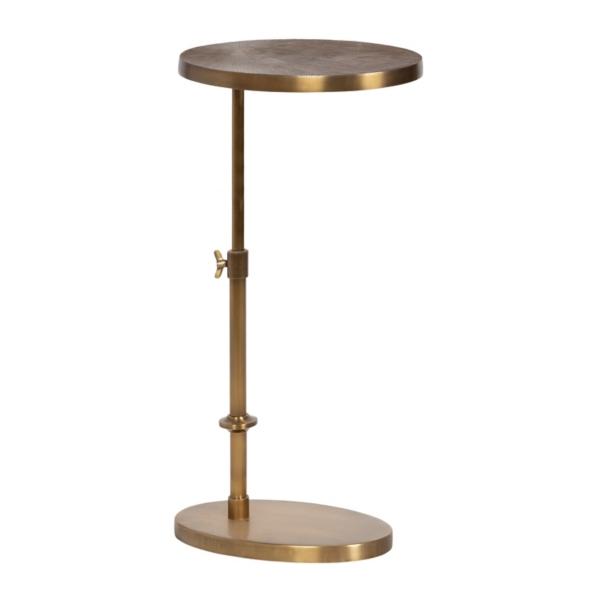 This Engles Gold Metal Oval Adjustable Table is a delightful blend of charm and modern elegance. Whether placed next to your favorite armchair, sofa, or bed, this table exudes a sense of refined style and functionality. Table measures 15W x 10D x 22H in. Crafted of metal Gold finish Oval shape Features an embossed sunburst pattern Adjusts to a maximum 28 inches tall Weight: 6.47 lbs. Weight capacity: 7 lbs. Assembly required Not intended for commercial use Care: Wipe with a soft, dry cloth. This item is available at Kirklands.com only, not available in stores. Please note: this item cannot be shipped to APO/FPO addresses.
