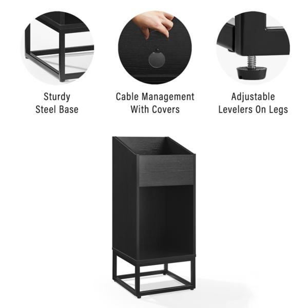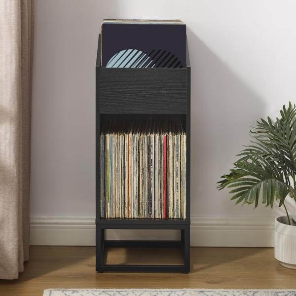 This Enzo Black 2-Section Record Storage Media Cabinet transforms your vinyl collection into a visual centerpiece, pairing a sleek finish with a sturdy steel base that fits easily into compact spaces. Its forward-facing display is perfect for showcasing your favorite album art! Overall dimensions Width: 14 in. Depth: 14 in. Height: 34.25 in. Crafted of wood and metal Black finish Features two (2) sections sized to fit full-size 12-inch records Upper section is designed for forward-facing record storage Each shelf holds up to 60 single albums Includes adjustable levelers on base Upper section weight capacity: 30 lbs. Lower section weight capacity: 35 lbs. Weight: 22.88 lbs. Assembly required Not intended for commercial use Care: Dust with a soft, dry cloth. This item is available at Kirklands.com only, not available in stores. Please note: this item cannot be shipped to APO/FPO addresses.