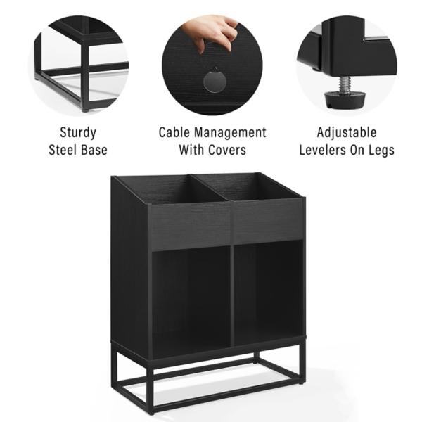 This Enzo Black 4-Section Record Storage Media Cabinet transforms your vinyl collection into a visual centerpiece, pairing a sleek finish with a sturdy steel base that fits easily into compact spaces. Its forward-facing display is perfect for showcasing your favorite album art! Overall dimensions Width: 27.25 in. Depth: 14 in. Height: 34.25 in. Crafted of wood and metal Black finish Features four (4) sections sized to fit full-size 12-inch records Upper sections are designed for forward-facing record storage Each shelf holds up to 60 single albums Includes adjustable levelers on base Upper section weight capacity: 30 lbs. Lower section weight capacity: 35 lbs. Weight: 38.72 lbs. Assembly required Not intended for commercial use Care: Dust with a soft, dry cloth. This item is available at Kirklands.com only, not available in stores. Please note: this item cannot be shipped to APO/FPO addresses.