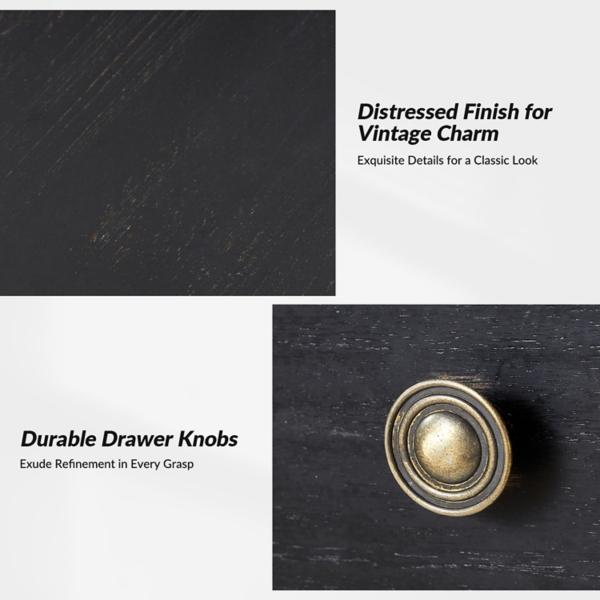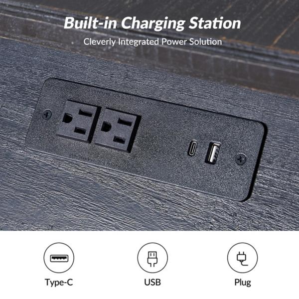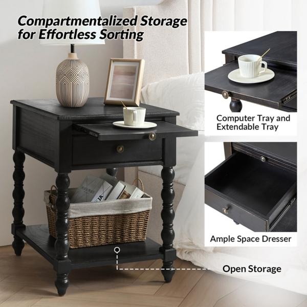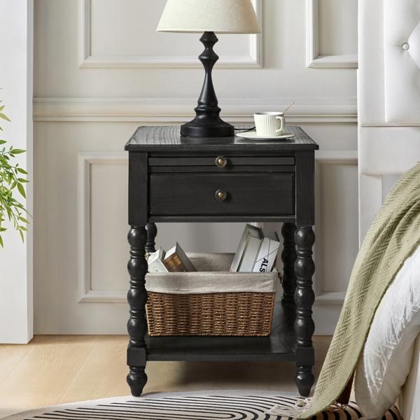 Elevate your home decor with this Erica Distressed Black Wood Spindle End Table, a perfect blend of functionality and timeless design. The distressed finish adds a touch of rustic charm to any space. End table measures 20W x 24D x 26H in. Crafted of solid wood Distressed black finish Features one (1) drawer, one (1) extendable tray, and one (1) lower shelf Equipped with a built-in charging station for plug-in cords, a USB cord, and a USB-C cord Spindle leg design Weight: 23 lbs. Weight capacity: 100 lbs. Assembly required; see Info & Guides in the drop down below to view or print assembly info Not intended for commercial use Care: Wipe with a soft, dry cloth. This item is available at Kirklands.com only, not available in stores. Please note: this item cannot be shipped to APO/FPO addresses.