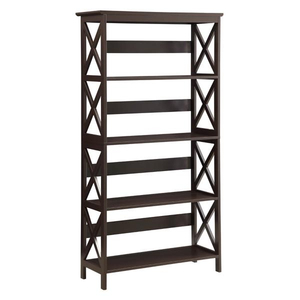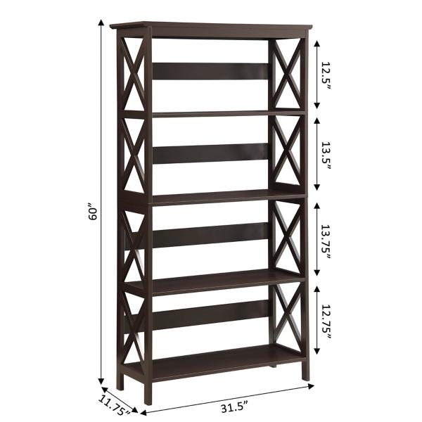 Add a modern touch to your storage with this Espresso 5-Tier Oxford Bookcase! Designed with both style and function in mind, this five-tier shelving unit is perfect for showcasing your favorite books, décor, and storage essentials. Bookcase measures 31.5W x 11.75D x 60H in. Crafted of MDF Espresso finish Features five (5) tiers of shelving X design on sides Weight: 40 lbs. Weight capacity: 15 lbs. per shelf Assembly required Not intended for commercial use Care: Wipe with a soft, dry cloth. This item is available at Kirklands.com only, not available in stores. Please note: this item cannot be shipped to APO/FPO addresses.