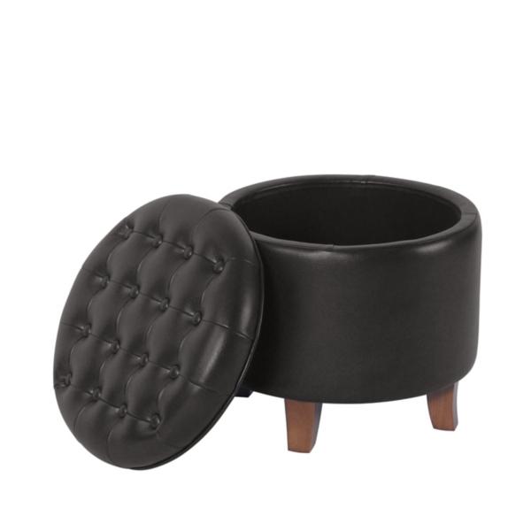 Keep your space tidy in style! This Espresso Faux Leather Tufted Storage Ottoman features a sophisticated look and a hidden storage compartment. You can hide away almost anything, from throw blankets to remotes! Ottoman measures 18H x 19 in. in height Crafted with a plywood and MDF frame Upholstered in faux leather with a foam cushion fill Honey oak leg finish Dark brown upholstery finish Features a tufted lift-off lid Includes hidden storage space Round shape Weight capacity: 250 lbs.; weighs 14.3 lbs. No assembly required Not intended for commercial use Care: Spot clean with damp cloth only. This item is available at Kirklands.com only, not available in stores. Please note: this item cannot be shipped to APO/FPO addresses. WARNING: Cancer and Reproductive Harm - For more information go to www.P65Warnings.ca.gov.