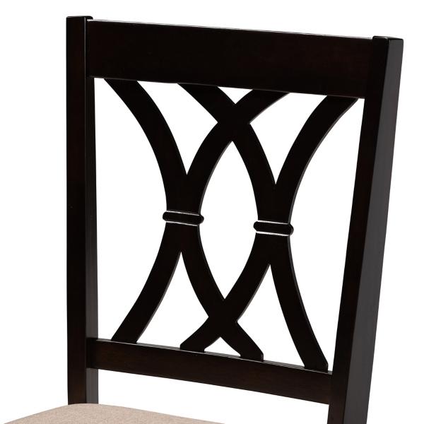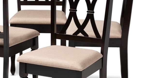 These Espresso Upholstered Reneau Dining Chairs are perfect for upgrading your dining room with an elegant touch! From their rich espresso finish to their plush seat cushions, these chairs are excellent for gathering around the table. Set includes four (4) dining chairs Each chair measures 17.7W x 20.5D x 37.4H in.; seat height: 18.5 in. Crafted of wood Upholstered in tan polyester with high-density foam Espresso finish Features a cut-out back design Turned legs Assembly required Not intended for commercial use Care: Spot clean. This item is available at Kirklands.com only, not available in stores. Please note: this item cannot be shipped to APO/FPO addresses.